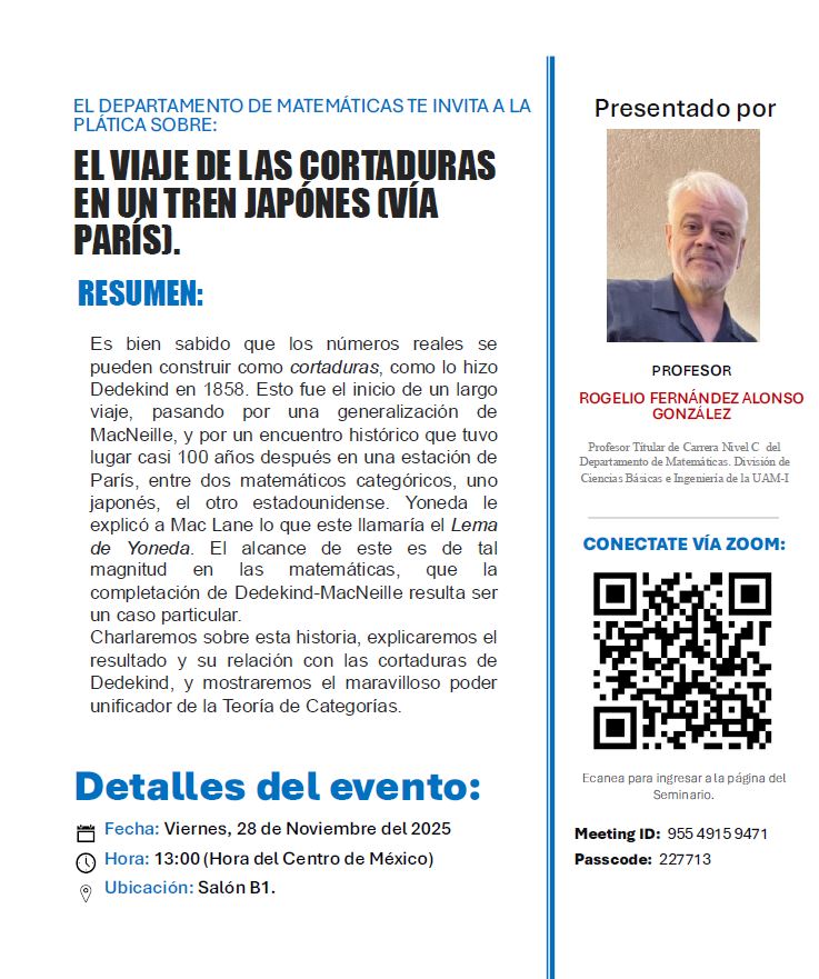 Charlaremos sobre esta historia, explicaremos el resultado y su relación con las cortaduras de Dedekind, y mostraremos el maravilloso poder unificador de la Teoría de Categorías.