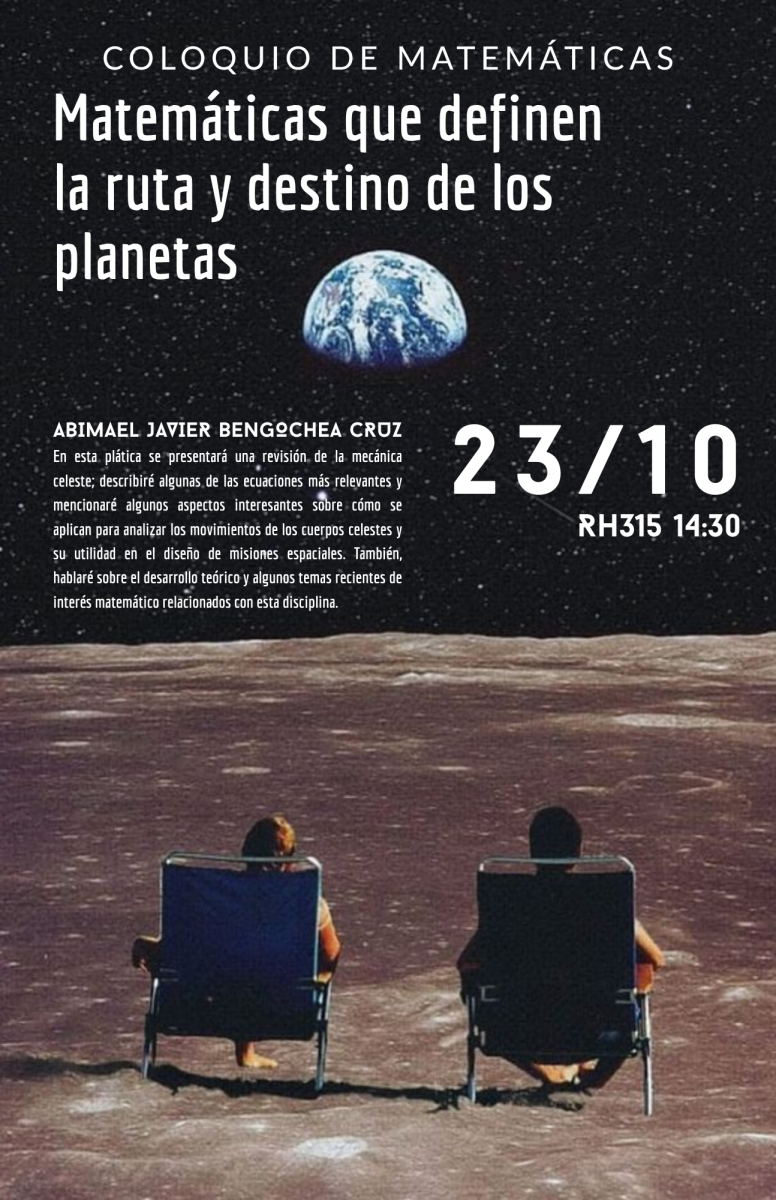 | 23 de octubre | Matemáticas que definen la ruta y destino de los planetas. | Abimael Bengochea | 14:30-15:30 | RH315 |
