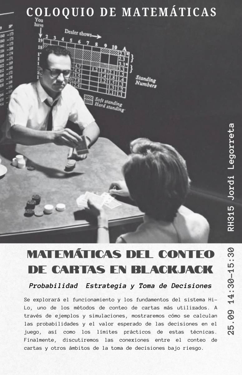 | 25 de septiembre | Matemáticas del Conteo de Cartas en Blackjack: Probabilidad, Estrategia y Toma de Decisiones | Jordi Legorreta Montaño | 14:30-16:00 | RH315 |