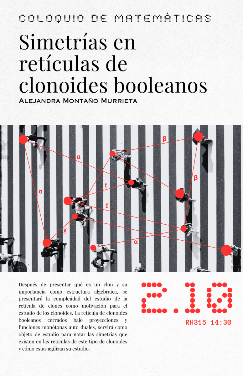 Después de presentar qué es un clon y su importancia como estructura algebraica, se presentará la complejidad del estudio de la retícula de clones como motivación para el estudio de los clonoides. La retícula de clonoides booleanos cerrados bajo proyecciones y funciones monótonas auto duales, servirá como objeto de estudio para notar las simetrías que existen en las retículas de este tipo de clonoides y cómo estas agilizan su estudio.