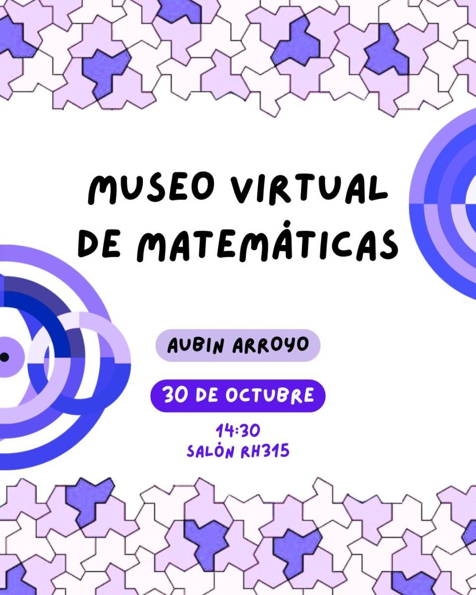 | 30 de octubre | Museo virtual de matemáticas | Aubin Arroyo | 14:30-15:30 | RH315 |