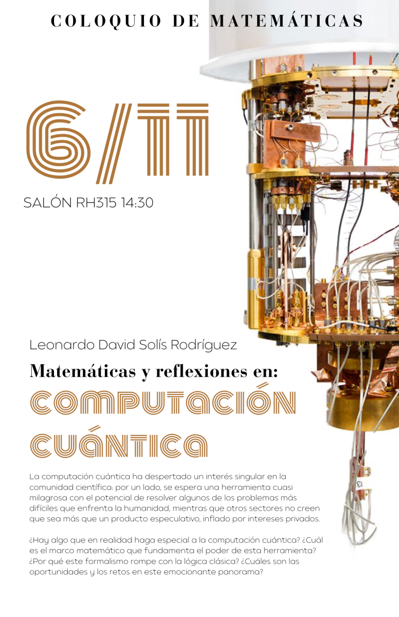 | 6 de noviembre | Matemáticas y reflexiones en computación cuántica | Leonardo David Solís Rodríguez | 14:30-15:30 | RH315 |