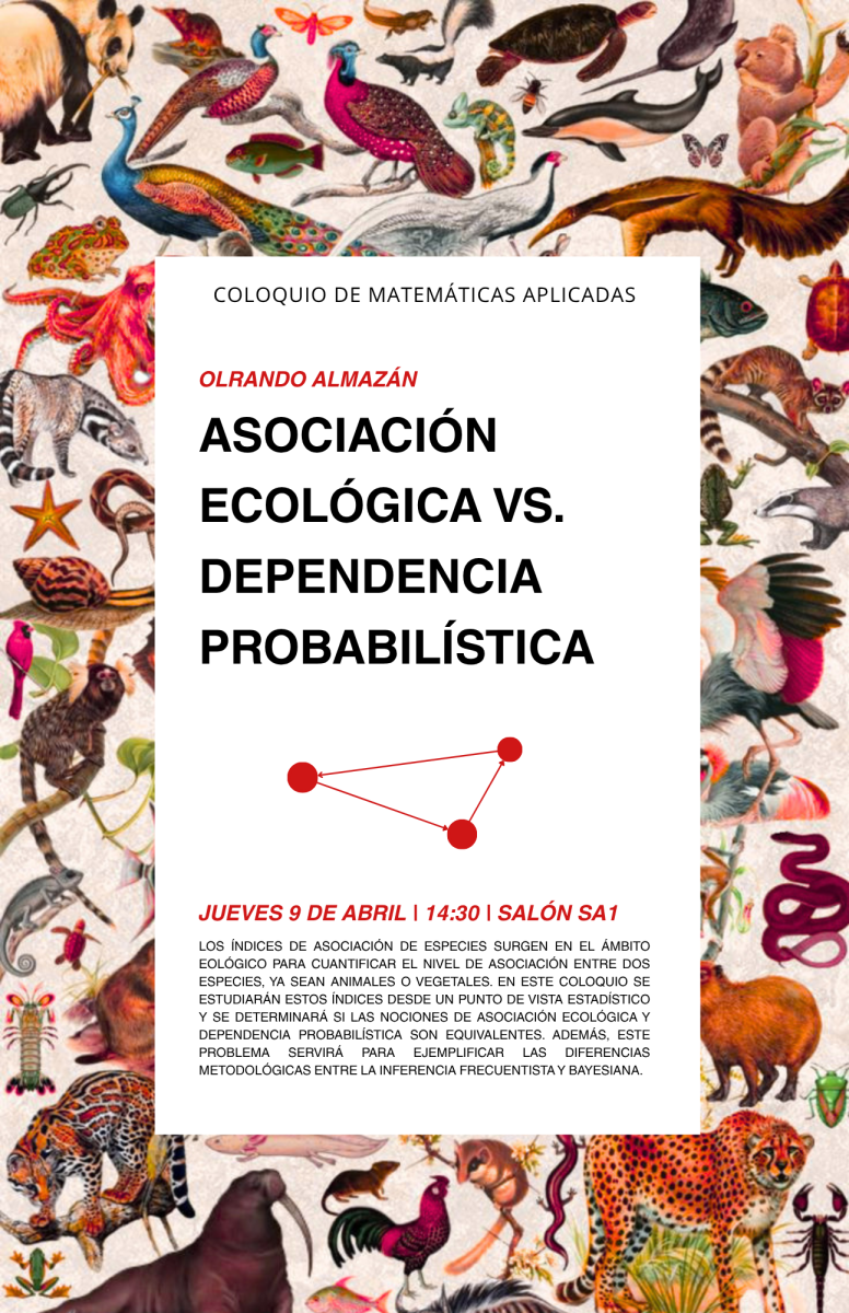 Los índices de asociación de especies surgen en el ámbito ecológico para cuantificar el nivel de asociación entre dos especies, ya sean animales o vegetales. En este coloquio se estudiarán estos índices desde un punto de vista estadístico y se determinará si las nociones de asociación ecológica y dependencia probabilística son equivalentes. Además, este problema servirá para ejemplificar las diferencias metodológicas entre la inferencia frecuentista y Bayesiana.