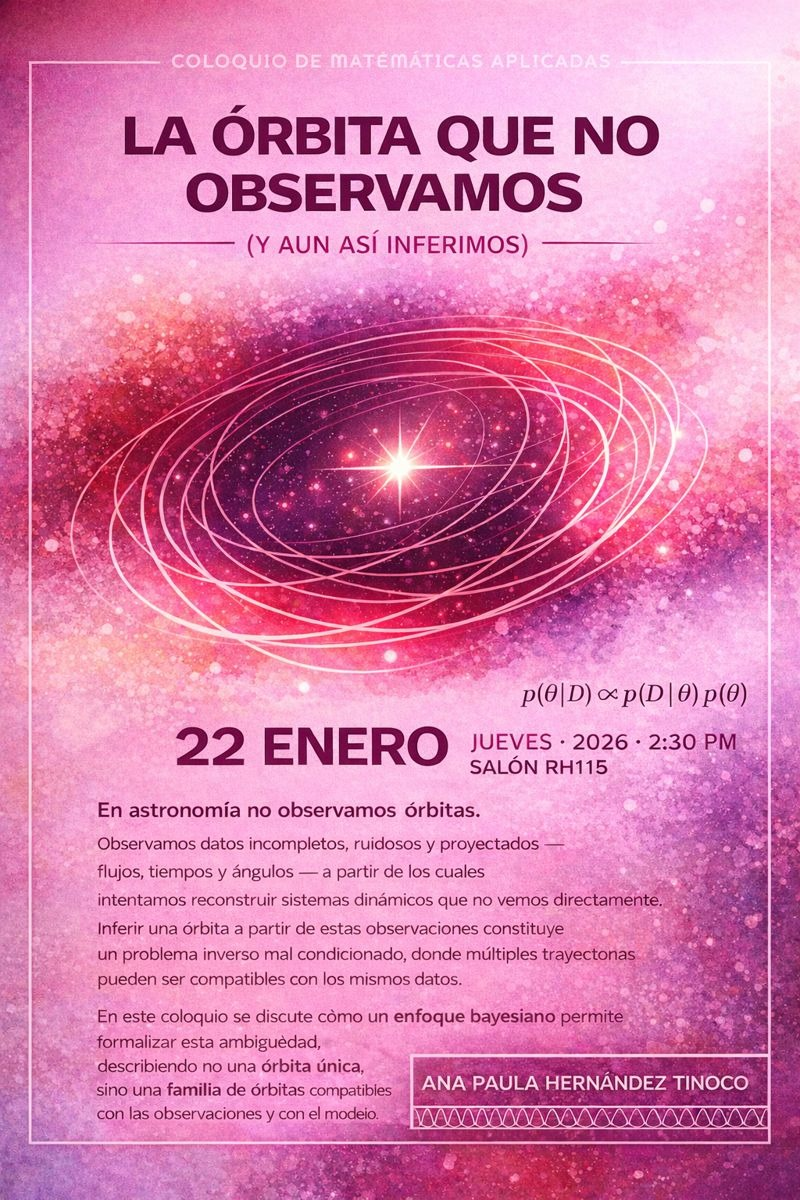 Observamos datos incompletos, ruidosos y proyectados a partir de los cuales intentamos reconstruir sistemas dinámicos que no vemos directamente. Inferir una órbita a partir de estas observaciones es un problema inverso mal condicionado: múltiples trayectorias pueden ser compatibles con los mismos datos. En este coloquio hablaré de cómo la inferencia bayesiana permite formalizar esta ambigüedad, describiendo no una órbita única, sino una familia de órbitas compatibles con las observaciones y con el modelo físico asumido.