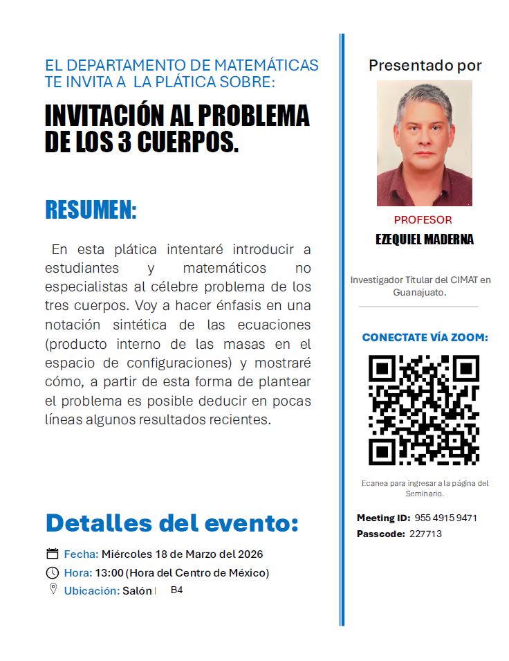 En esta plática intentaré introducir a estudiantes y matemáticos no especialistas al célebre problema de los tres cuerpos. Voy a hacer énfasis en una notación sintética de las ecuaciones (producto interno de las masas en el espacio de configuraciones) y mostraré cómo, a partir de esta forma de plantear el problema es posible deducir en pocas líneas algunos resultados recientes.