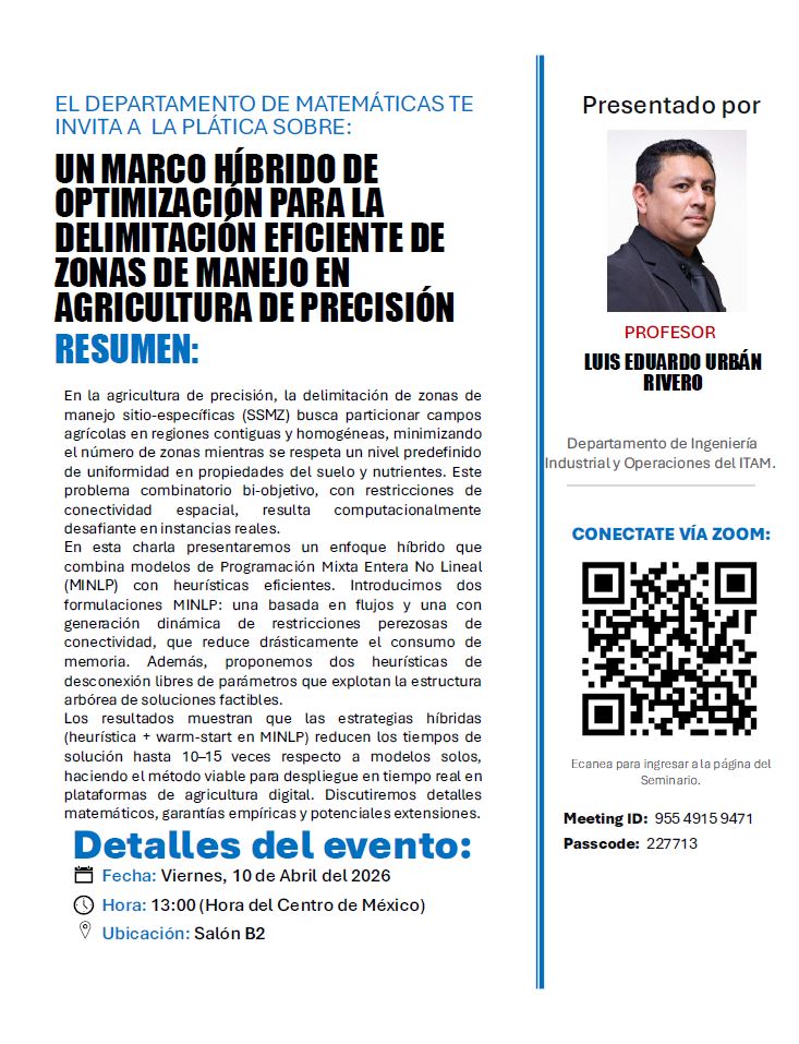 El Seminario de Matemáticas está dirigido tanto a profesores e investigadores como a estudiantes. Se presentan temas de investigación y de divulgación de diversas áreas de las matemáticas. Los expositores suelen pertenecer de otras instituciones o ser profesores y/o investigadores del ITAM. Las pláticas están estructuradas a manera que alguien que no sea especialista del tema pueda entender las ideas principales de la exposición con una sesión de preguntas al final. Semanalmente se actualiza la información sobre los seminarios y también se pueden consultar los seminarios de semestres anteriores. Estos seminarios son coordinados por Joao Morais.