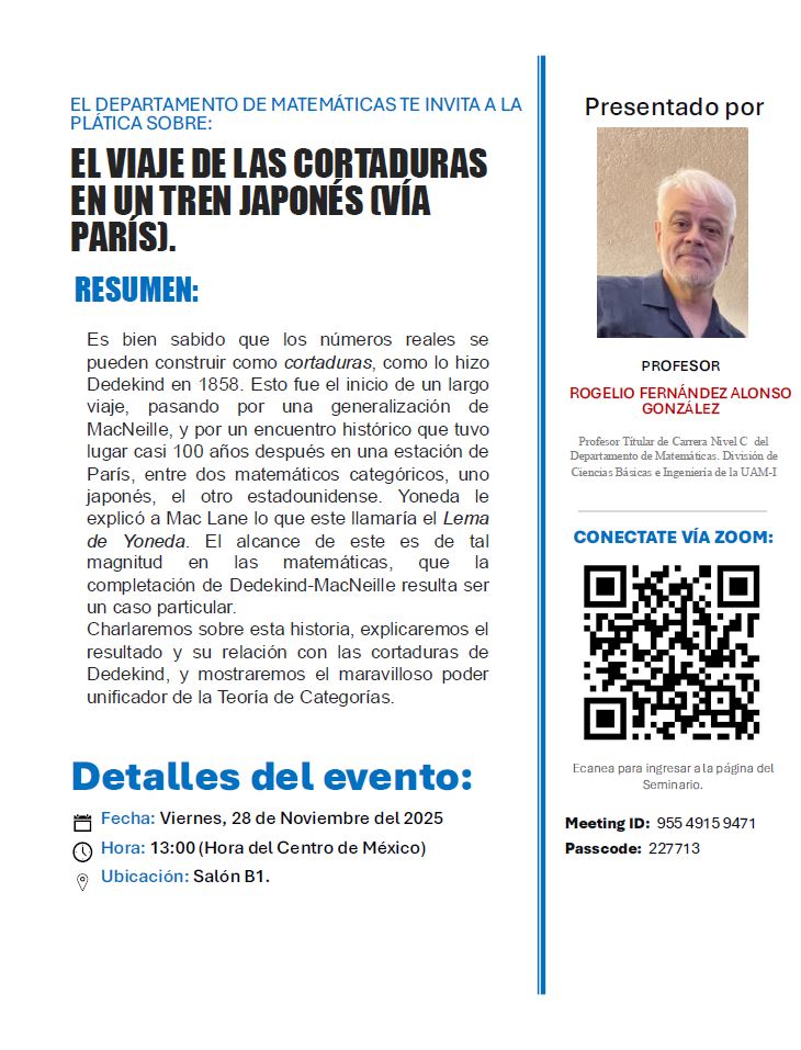 Charlaremos sobre esta historia, explicaremos el resultado y su relación con las cortaduras de Dedekind, y mostraremos el maravilloso poder unificador de la Teoría de Categorías.